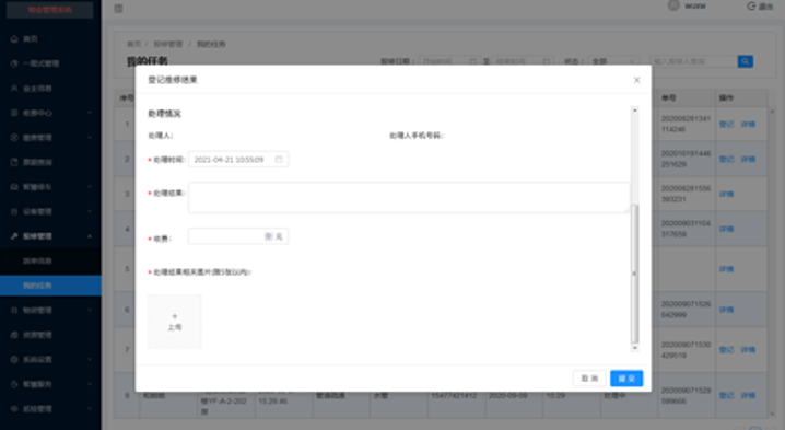 物业管理系统通过自定义工单流程,支持派单、抢单,合理化工作安排,提供服务积极性。工单支持添加报修记录、维修记录、回访记录等,支持拍照上传,从而实现工单全程管控。