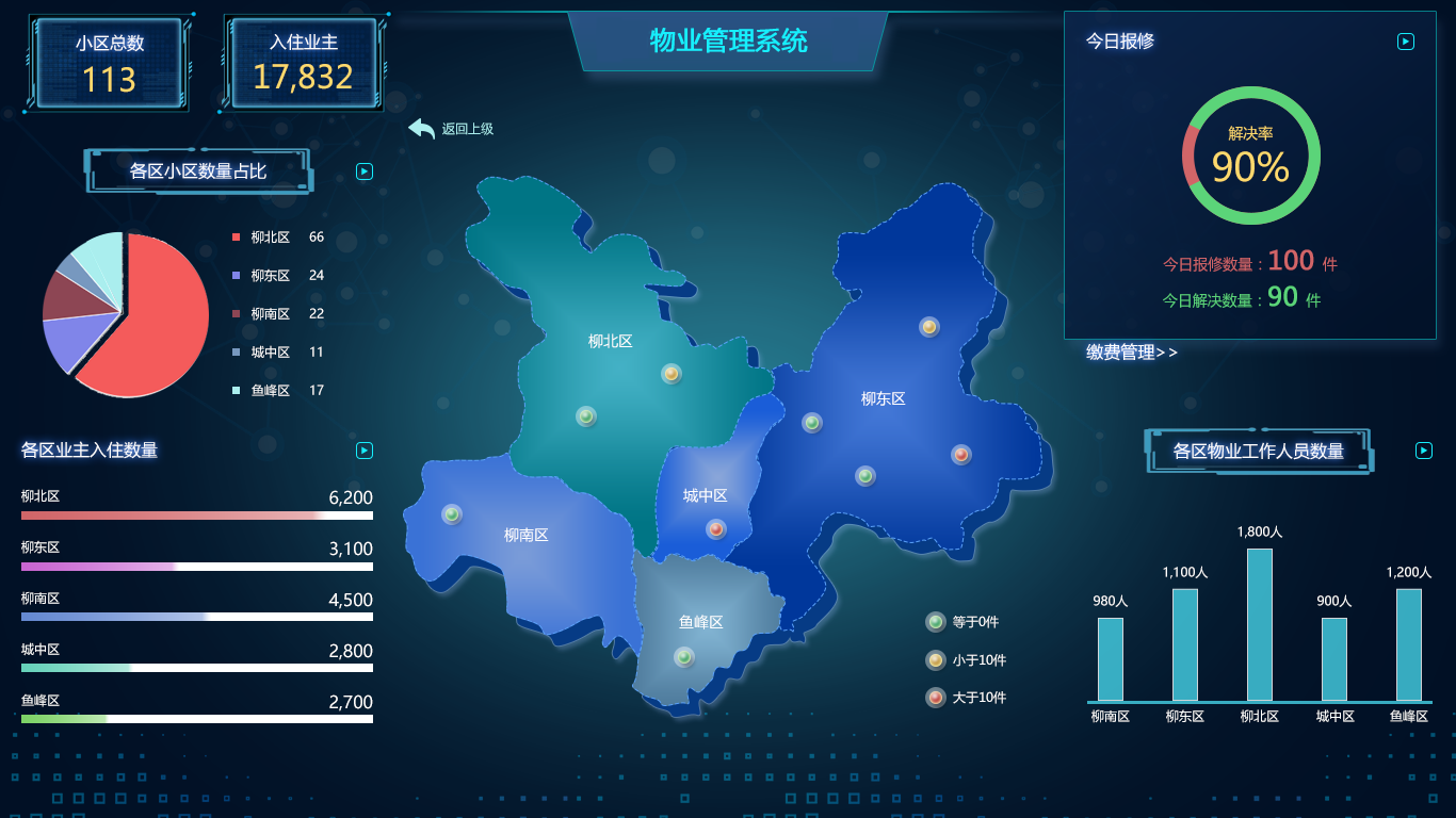 物业管理系统功能包括资源管理、财务管理、收费管理、缴费管理、物资管理、设备管理、安保巡逻、票据管理、仪表管理、系统管理等功能模块。通过流程化日常管理:从业主房屋信息、车位信息、设备信息、物资信息等基础数据的管理,到业主相关的报事报修管理、水费、电费等,到日常收费、商铺、车位费等,预收费、生成催费通知单、财务报表等财务数据,通过科学管理物业办公更加高效,员工管理更智能,同时提升业主满意度。