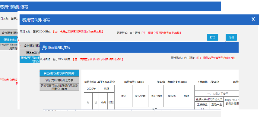 研发费用归集管理系统可进行包括自主研发“研发支出”辅助账、委托研发“研发支出”辅助账、合作研发“研发支出”辅助账、集中研发“研发支出”辅助账、“研发支出”辅助账汇总表、研发项目可加计扣除研究开发费用情况归集表几大报表的填写。